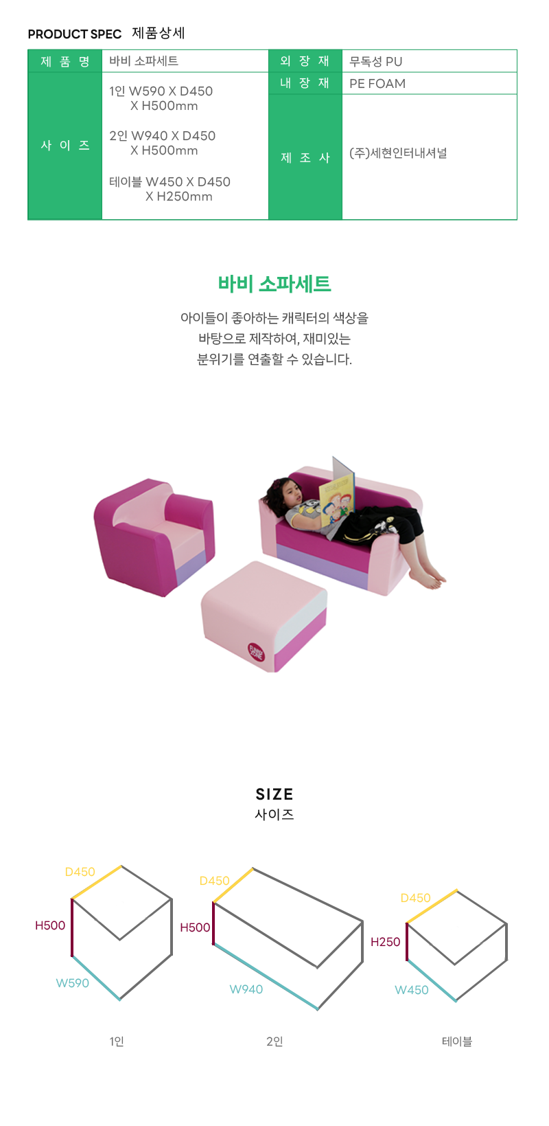 "1인쇼파 : 59×45×50cm2인쇼파 : 94×45×50cm테이블 : 45×45×25cm"/앉는높이 25cm