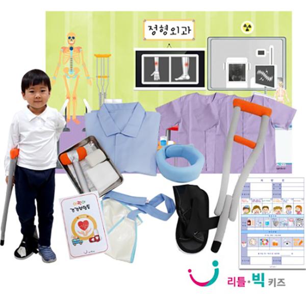 무대배경1, 의사가운1, 간호사가운2, 목보호대1,발보호대신발1, 팔보호대1, 검진망치1, 붕대4, 목발1,거즈20, 반창고2, 엑스레이필름2, 처방전20, 건강보험증20