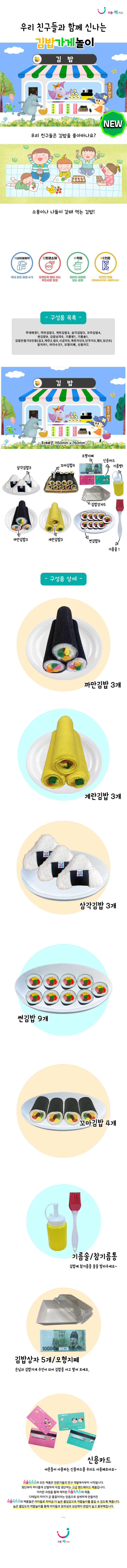 무대배경1,까만김밥3,계란김밥3,삼각김밥3,꼬마김밥4,썬김밥9,김밥상자5,기름병1,기름솔1,김밥만들기5인용(김3,계란2,밥5,시금치5,계란지단5,단무지5,햄5,당근5),앞치마1,머리수건1,모형지폐,신용카드