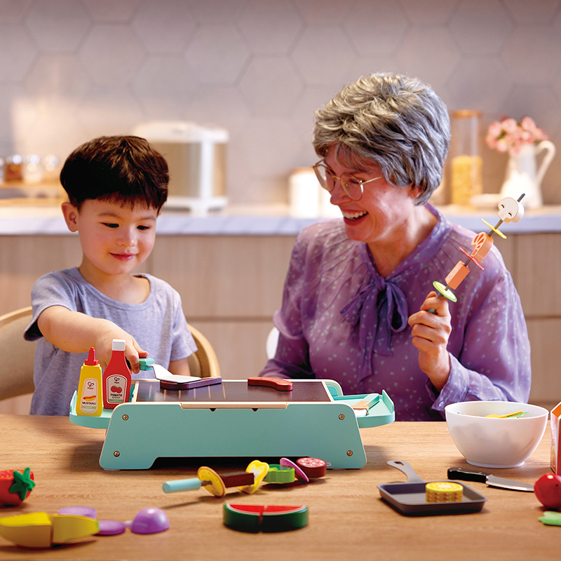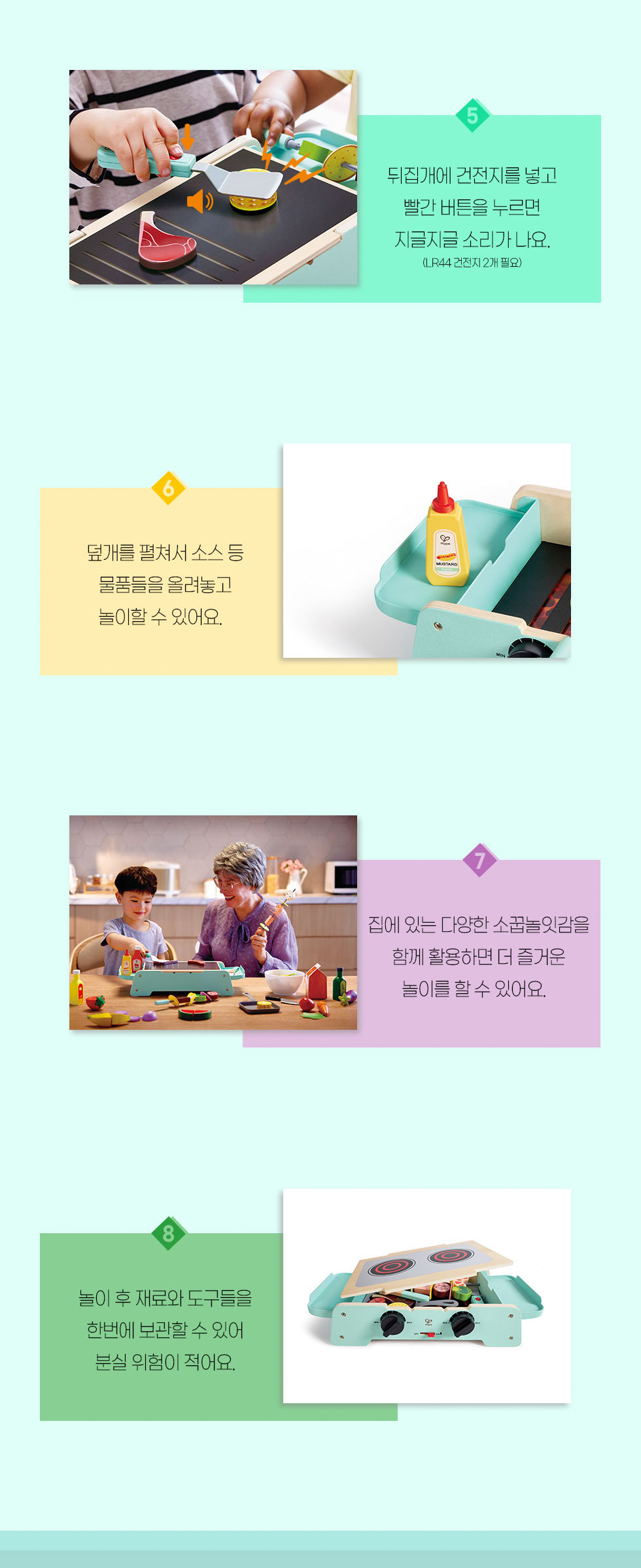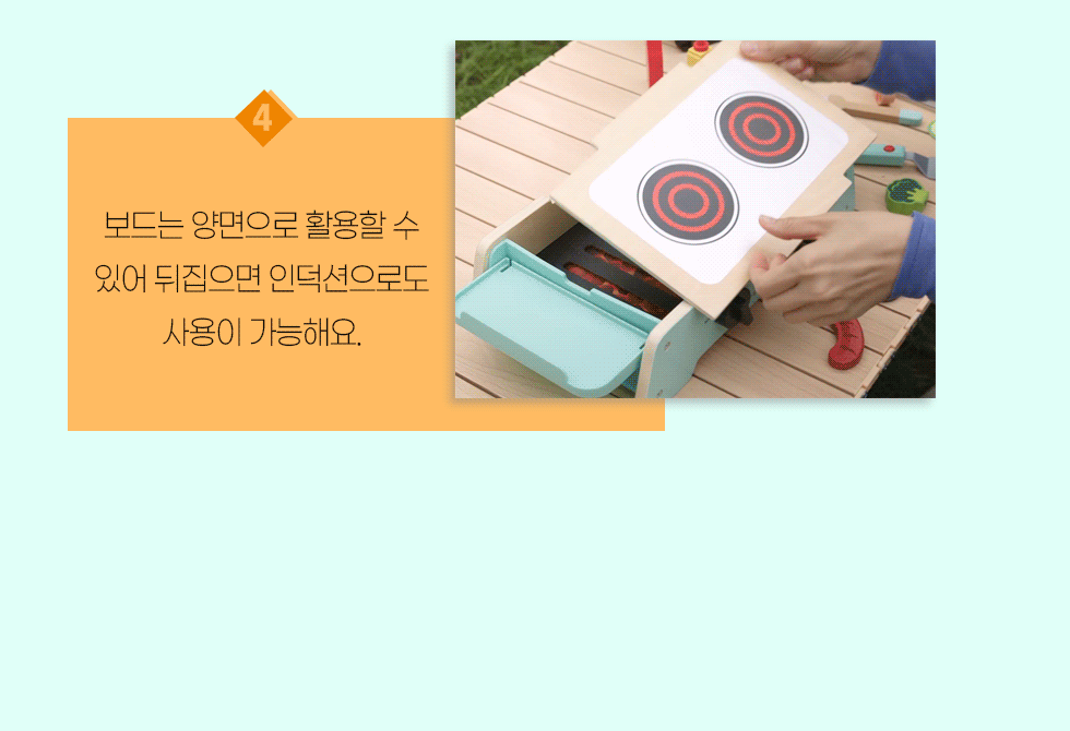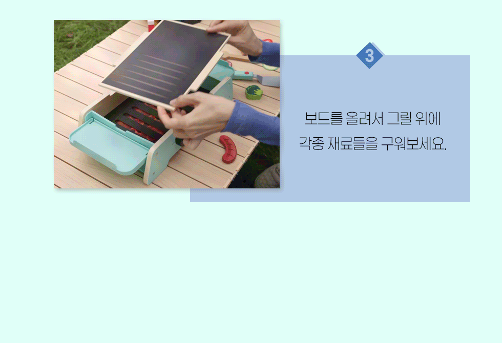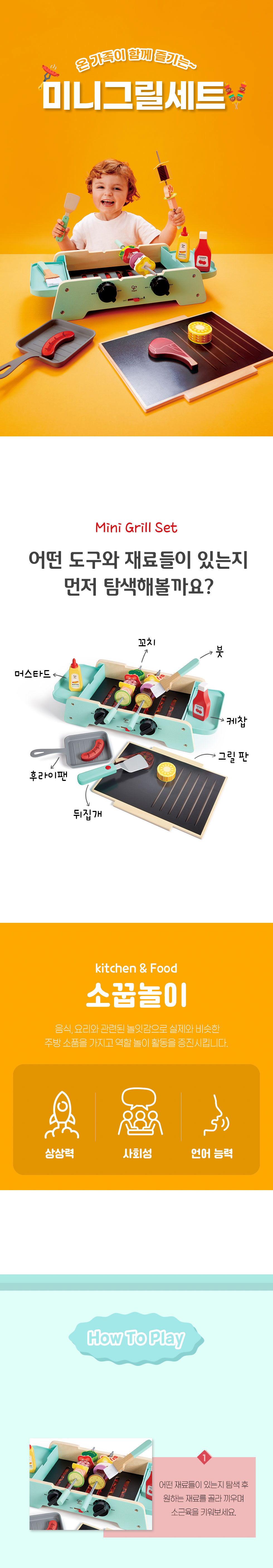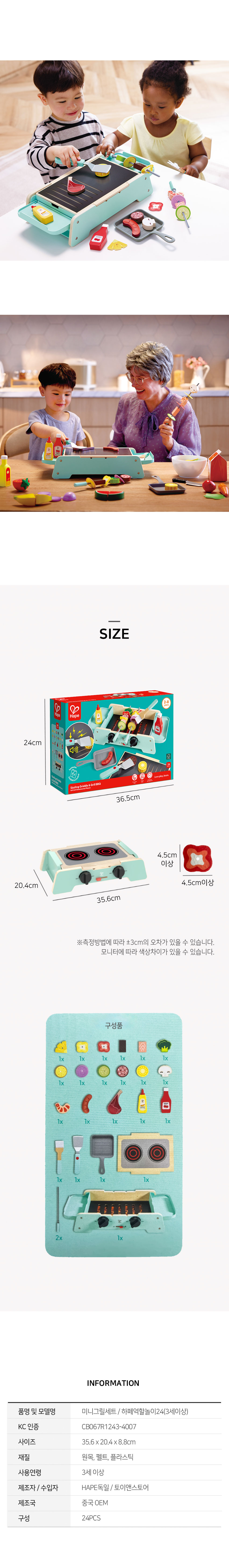 35.6×20.4×8.8cm,구성:그릴 본체 1개, 양면 불판 1개, 요리도구 5개, 음식모형 17개