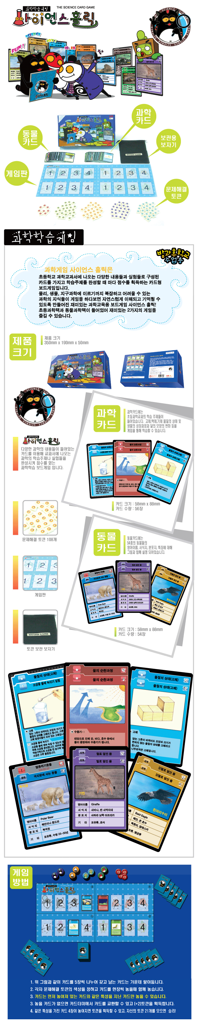 35×19×5cm/게임보드판,동물카드55장,과학카드55장,타일108개,매뉴얼,타일스티커,보관주머니