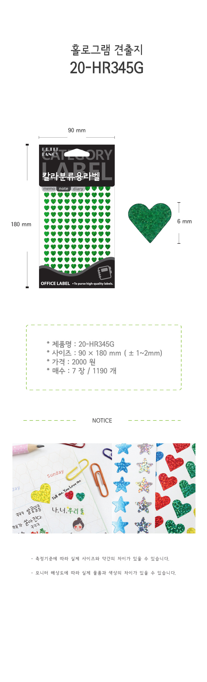 견출지/홀로그램/7매/하트/20-HR345/녹색