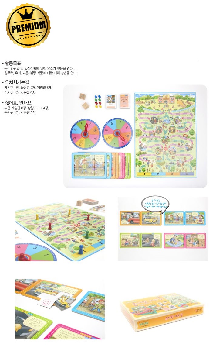 41×31×6cm,게임판 1장, 돌림판 2개, 게임말 8개, 주사위 1개, 사용설명서, 퍼즐 게임판 8장, 상황카드 64장, 주사위 1개, 사용설명서