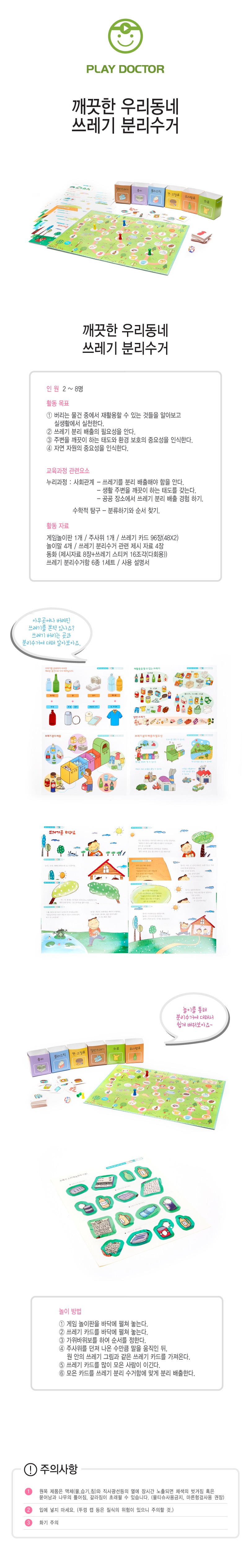 게임놀이판 1개,주사위 1개,쓰레기 카드 96장(48×2),놀이말 4개,쓰레기 분리수거 관련 제시 자료 4장,동화 (제시자료 8장+쓰레기스티커16조각(다회용),쓰레기 분리 수거함 6종 1세트,사용설명서