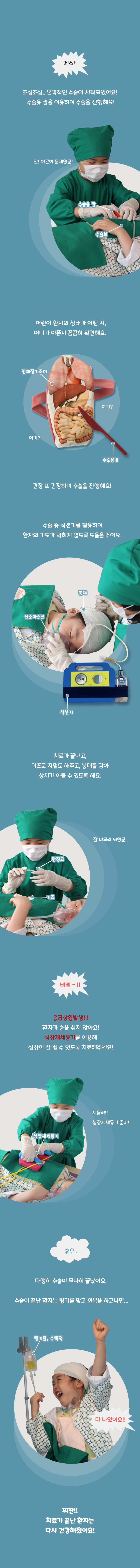 무대배경1,수술의사가운1,수술의사모자1,수술실간호사가운2,수술실간호사모자2,환자복1,환자모자1,수술보1,산소마스크1,인체장기조끼1,심장충격기1,석션기1,트레이1,거즈30,붕대3,집게2,매스2,반창고2,주사기2,링거
