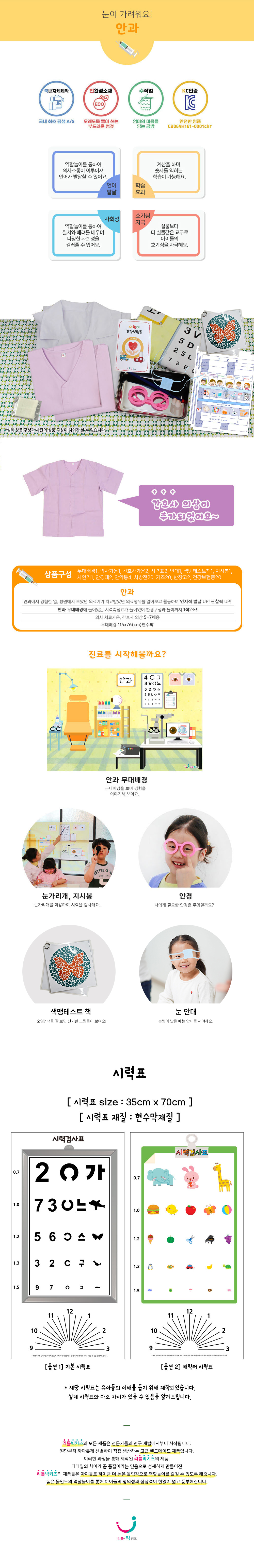 무대배경1,의사가운1,간호사가운2,시력표2,색맹테스트책1(8p),지시봉1,차안기1,안경테2,안약통4,처방전20,거즈20,반창고2,안대1,건강보험증20