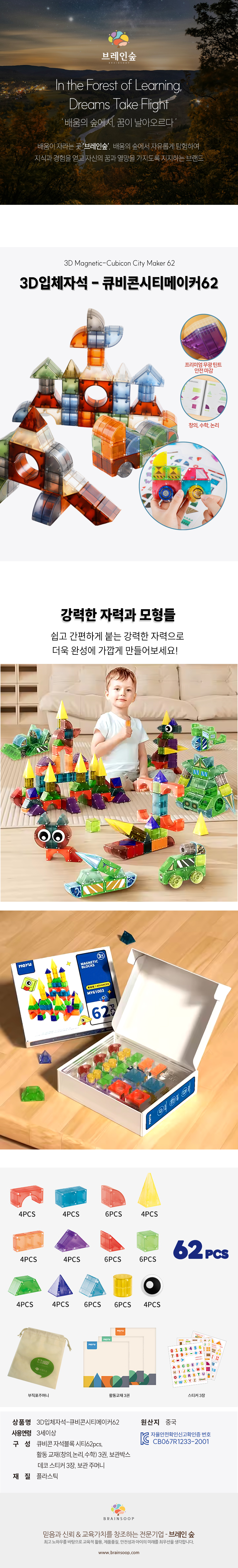 정육면체기준3cm,Box36.5×29.5×9cm(변동가능),ABS,회전자석,큐비콘자석블록시티62pcs,활동교재(창의,논리,수학)3권,데코스티커3장,보관주머니
